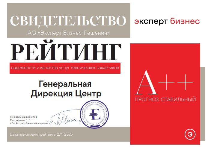 ГДЦ была выбрана в первую пятерку среди компаний технических заказчиков, получивших наивысший рейтинг надежности на уровне А++, что определяется как наивысший по применяемой шкале уровень надежности и качества услуг технического заказчика.